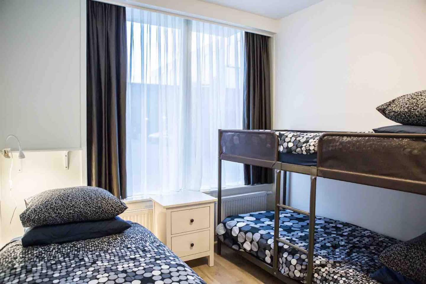 - Ground Level: Includes two bedrooms consisting of 3 single beds + a bunk bed, fully-equipped kitchen with two half refrigerators, washing machine/dryer combi, two separate toilet rooms, shower room and living room lounge with TV.